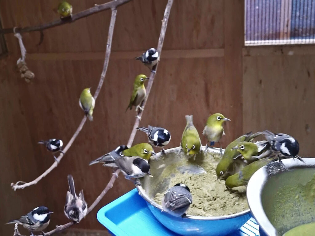 個体数に対して十分な数の餌入れを用意し、餌を巡る争いが起こらないように管理していますが、時には餌入れに移すのを待ちきれずに群がってくることがあります。この写真には違法飼養から保護された4種の野鳥が写っています。