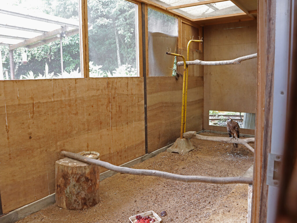 屋内に複数の小型ケージを設置している他、屋外にはフライングケージや大型猛禽用のフライングケージも設置しています。
